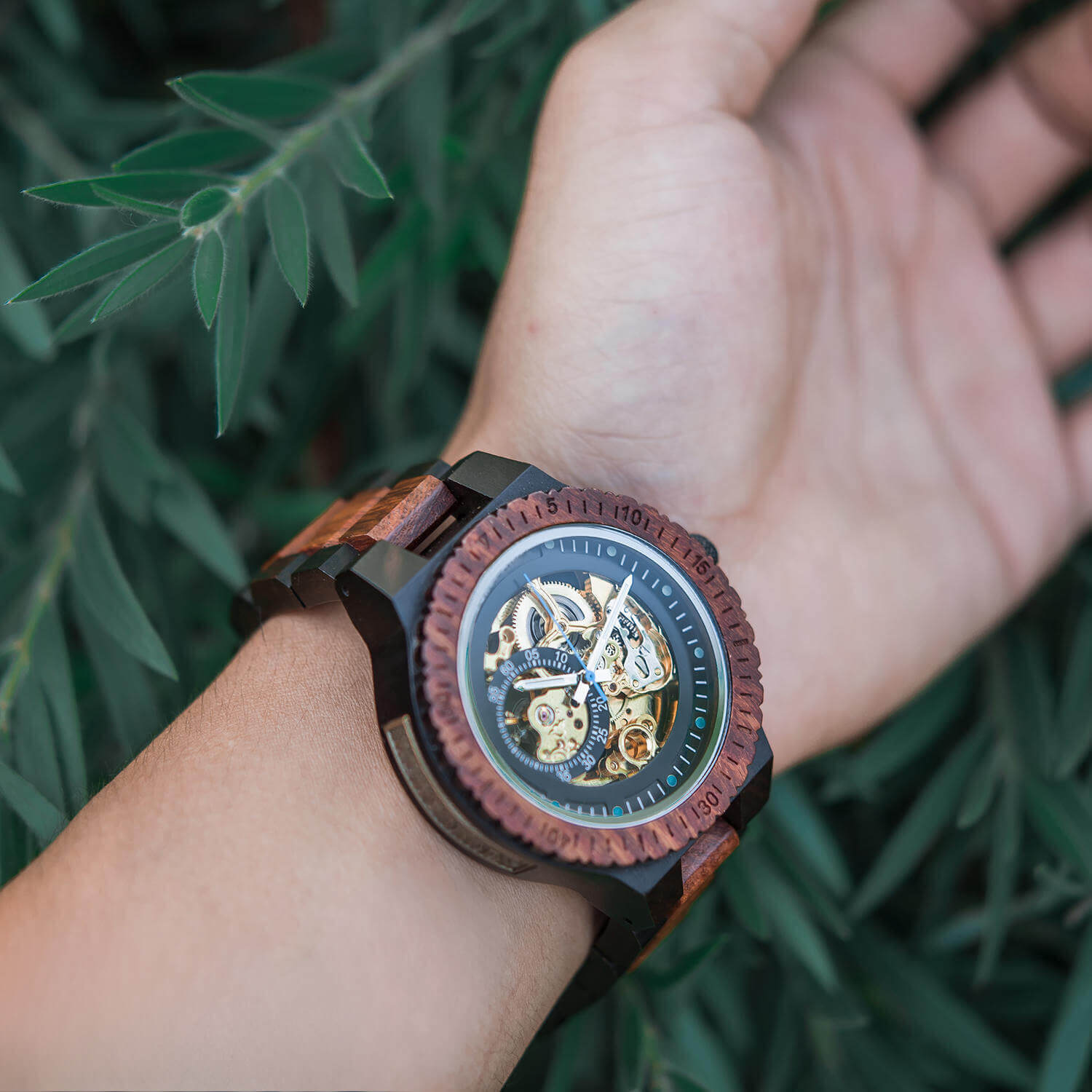 FLAME: El corazón ardiente de la renovación. Este reloj esqueleto para hombre celebra la pasión y la vida continua con su mecanismo visible. Los cálidos tonos de madera encapsulan la llama eterna del Phoenix.