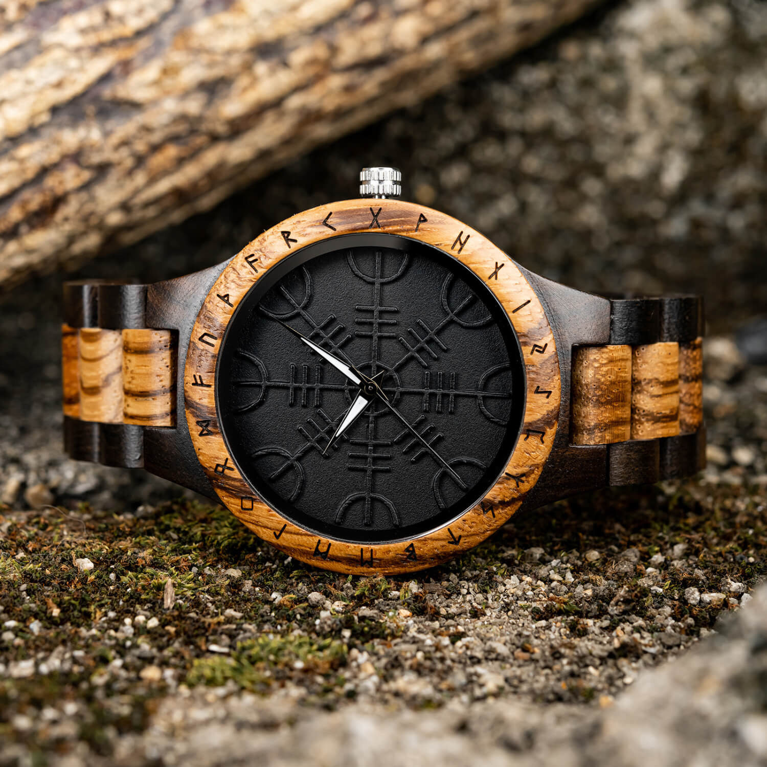 Realizzato con precisione in legno di zebrano e ebano e ispirato all'antico simbolo norreno, questo orologio presenta una cassa distintiva adornata con l'Aegishjalmur (Helm of Awe), un simbolo irlandese ritenuto capace di offrire protezione e potere.